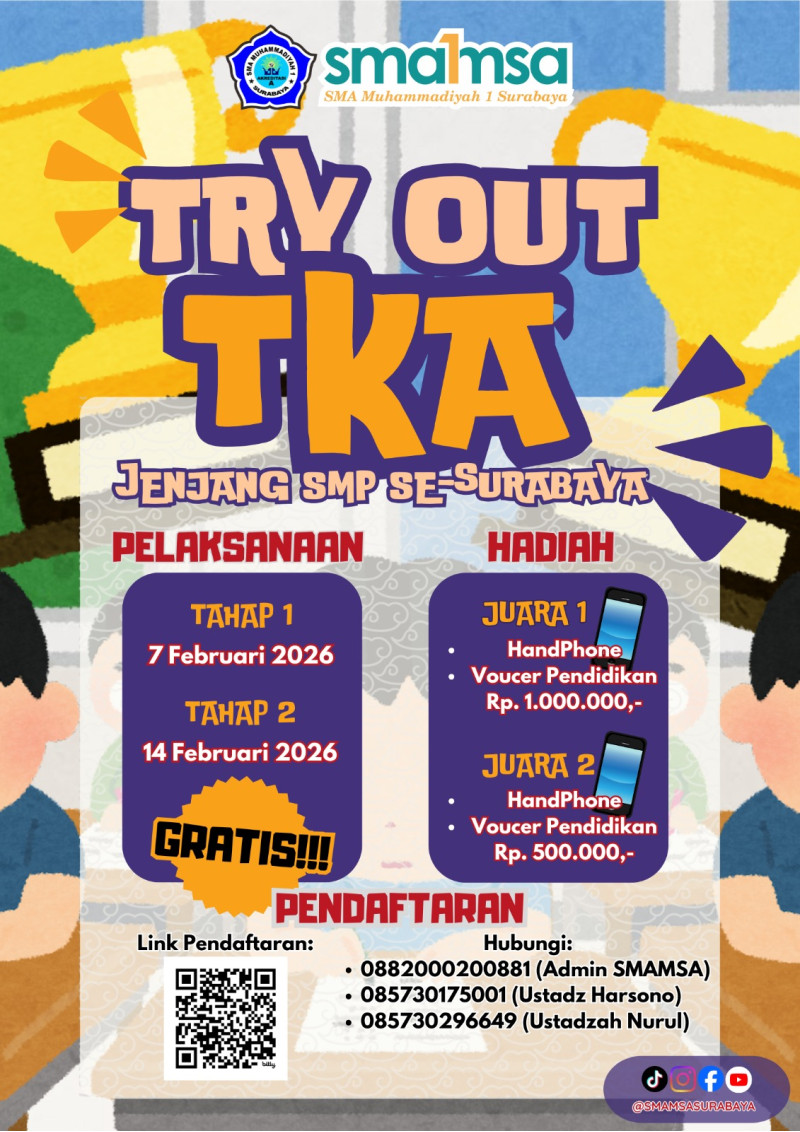 SURABAYA – Memasuki semester genap tahun ajaran 2025/2026, SMA Muhammadiyah 1 (SMAMSA) Surabaya kembali menunjukkan kepeduliannya terhadap persiapan akademik siswa tingkat menengah pertama. SMAMSA secara resmi mengumumkan penyelenggaraan Try Out Tes Kemampuan Akademik (TKA) yang diperuntukkan bagi siswa SMP/MTs sederajat di seluruh Surabaya.