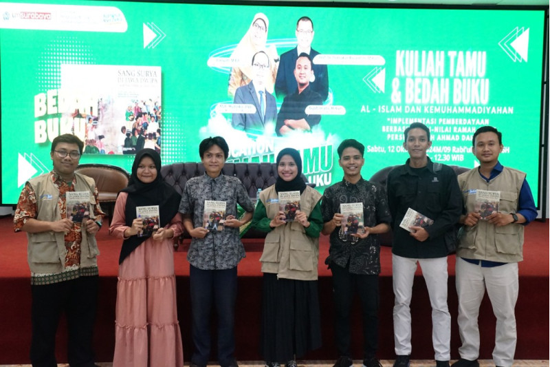 SMA Muhammadiyah 1 Surabaya. Kegiatan bedah buku “Sang Surya di Jawa Dwipa, Jejak Kaki Kiai Dahlan di Jawa Timur” dilaksanakan Sabtu (12/10/2024) oleh LPAIK UMSurabaya. Sebanyak 900 mahasiswa masuk langsung ke gedung lantai 13, sedangkan 1.400 mahasiswa lainnya masuk secara daring. Dalam hal ini Tegu Emami, SHum, MSosio, anggota MPID PWM Jatim, Prof Dr Purnavan Basunduru, SS MHum, dan Moh Mudzakir, PhD selaku pembedah buku.